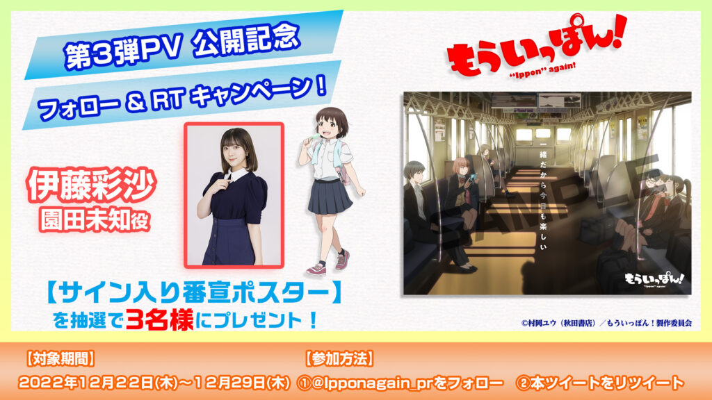 対象期間中、TVアニメ「もういっぽん!」公式Twitter(@Ipponagain_pr)をフォローし、対象ツイートをリツイートしていただいた方の中から抽選で3名様に【園田未知役 伊藤彩沙さんサイン入り番宣ポスター】をプレゼントいたします!