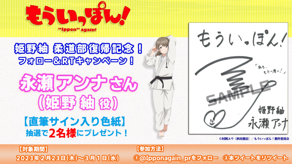 対象期間中、TVアニメ「もういっぽん!」公式Twitter(@Ipponagain_pr)をフォローし、対象のツイートをRTしていただいた方の中から抽選で2名様に【キャスト直筆サイン入り色紙】をプレゼントいたします!